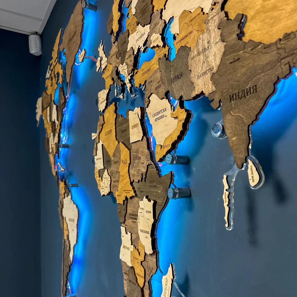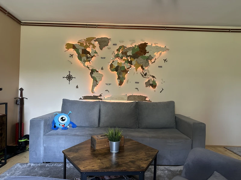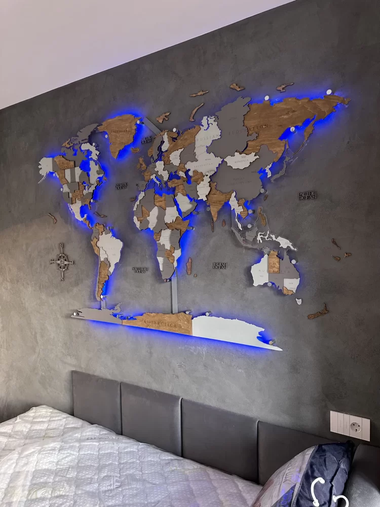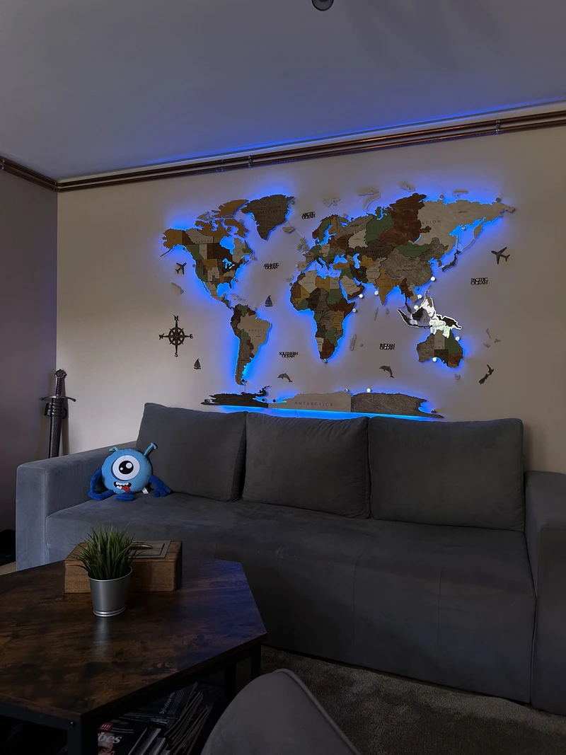 Harta din lemn 3D a lumii cu iluminare LED RGB schimbă atmosfera spațiului dumneavoastră.