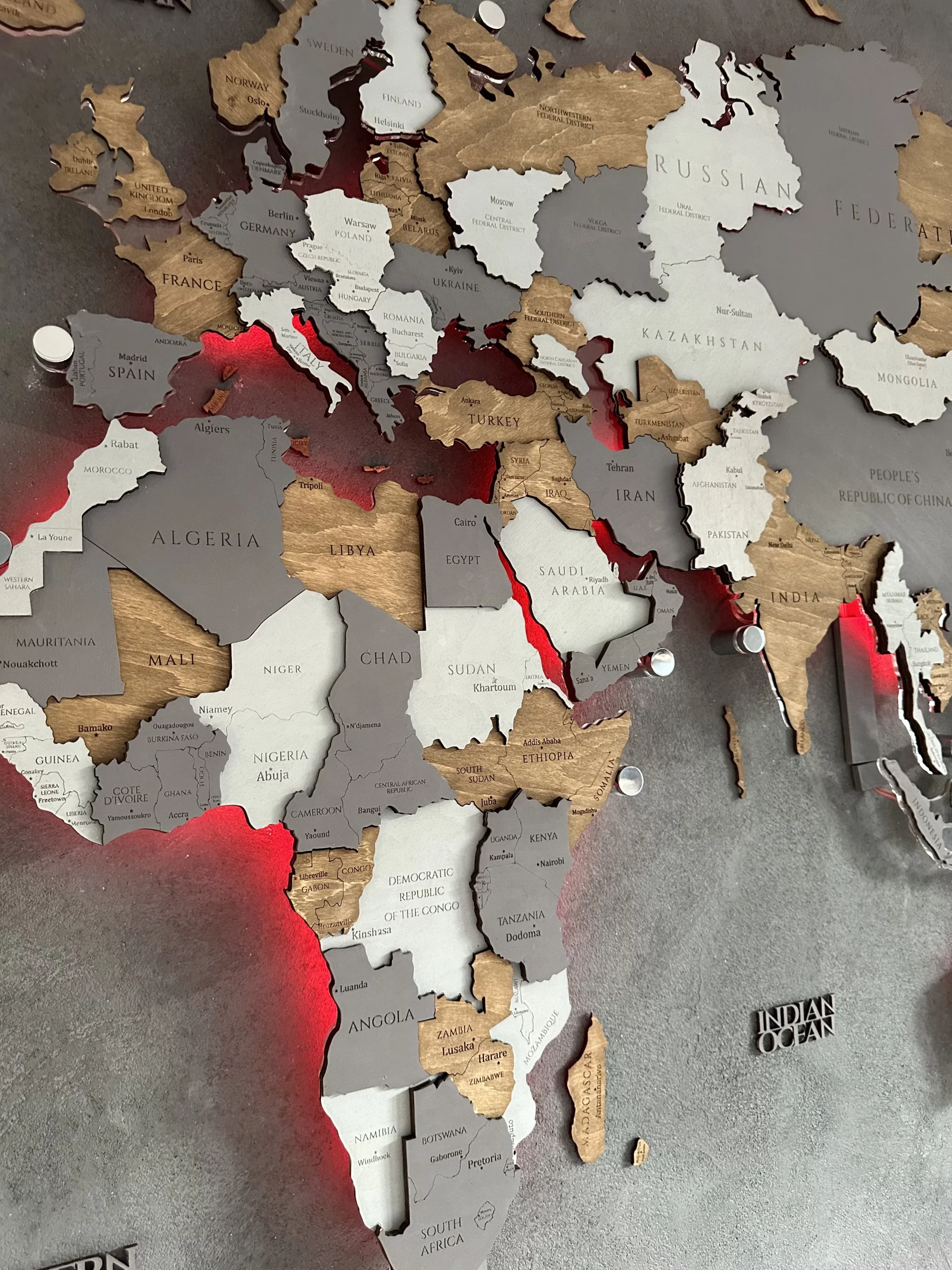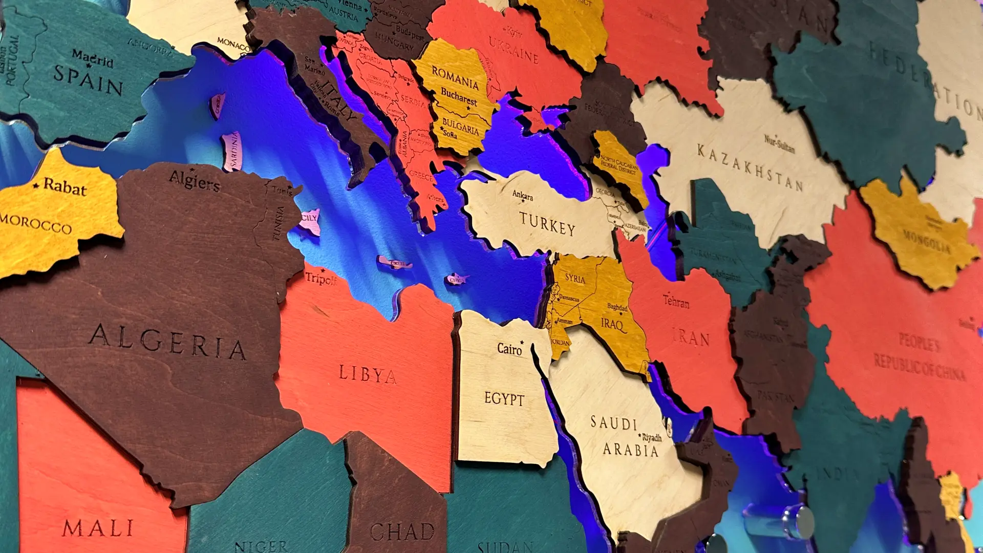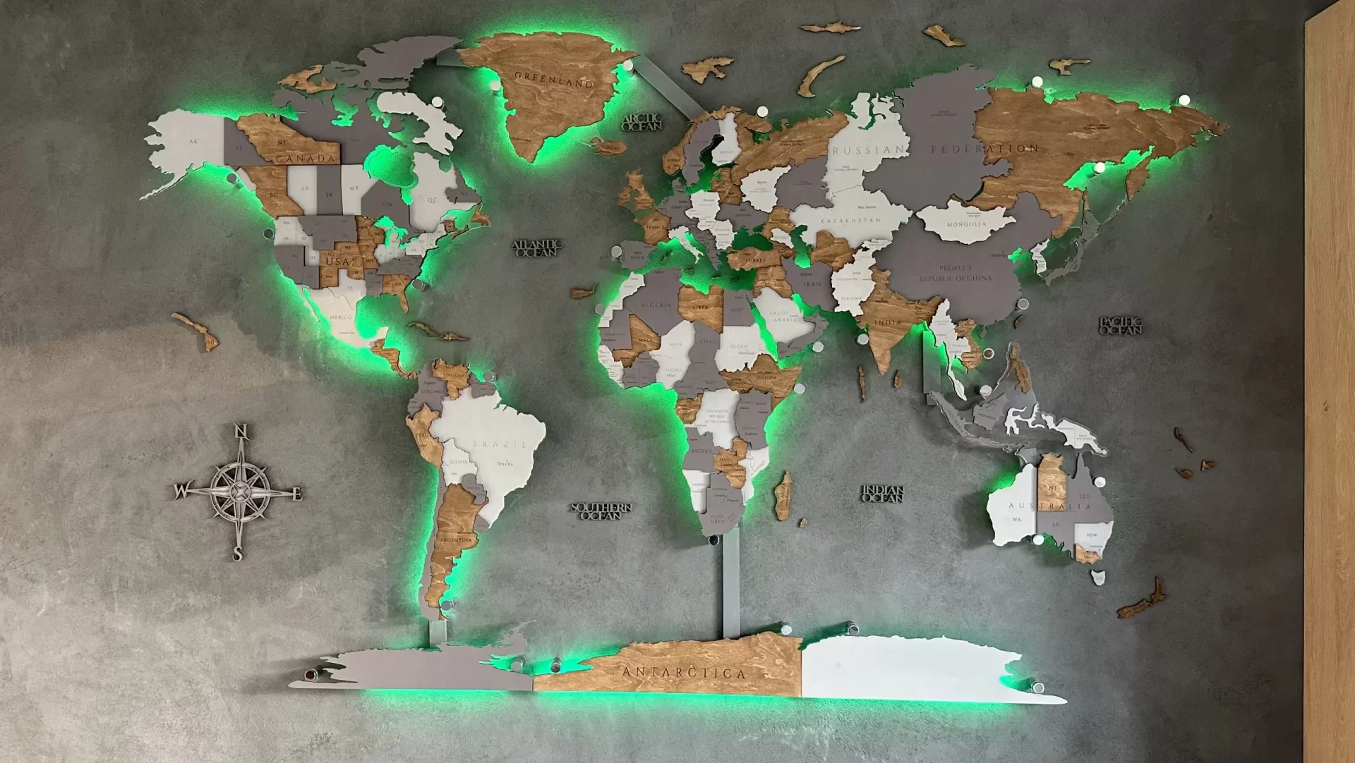 Harta din lemn 3D a lumii cu iluminare LED RGB schimbă atmosfera spațiului dumneavoastră.