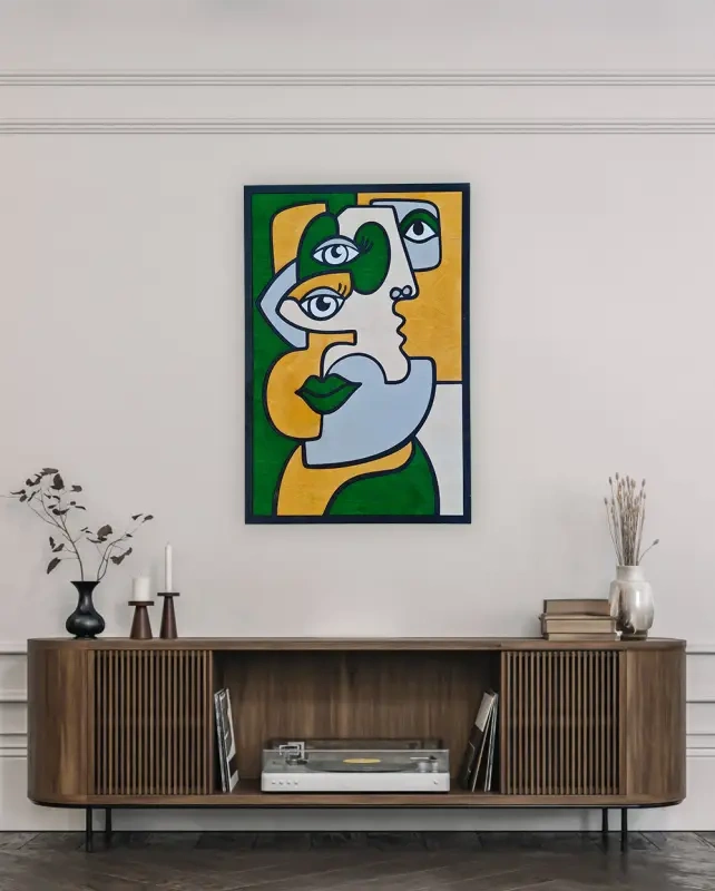Inspirat de cubism și de opera marelui Pablo Picasso, panoul exprimă figuri și emoții umane prin geometrie abstractă.Materiale naturale și sustenabile